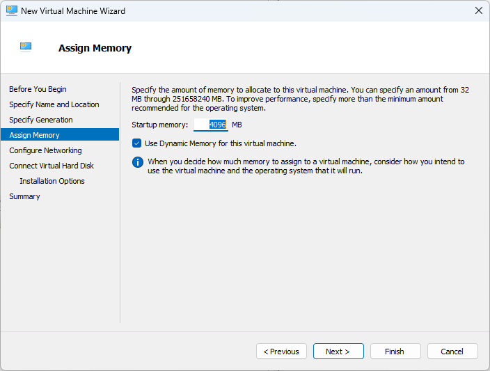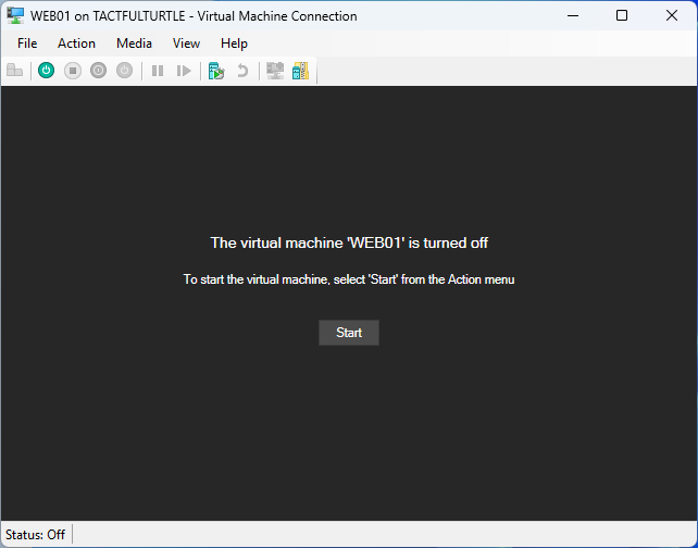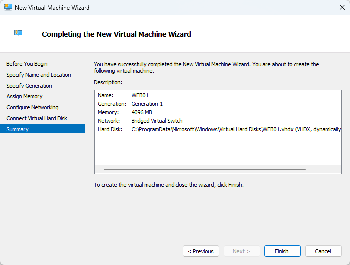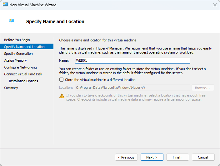 Create a new VM in Hyper-V Manager. For this example, I called it WEB01. I have already created one call DC01 and will create another called SQL01.