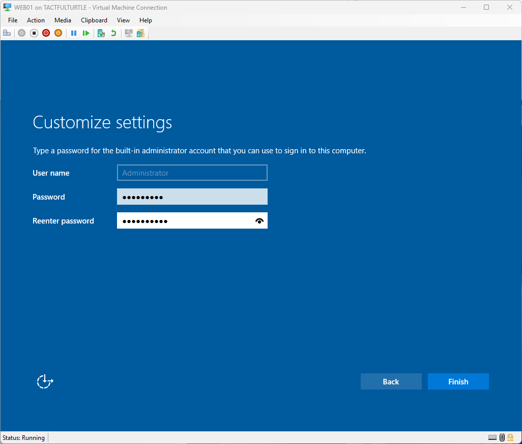 Enter a password twice for the local Administrator password and click Finish.