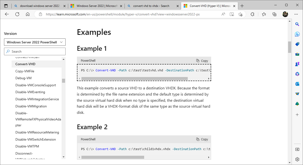 PS C:\> Convert-VHD -Path .\WindowsServer2022.VHD -DestinationPath .\Server2022VHDX.VHDX