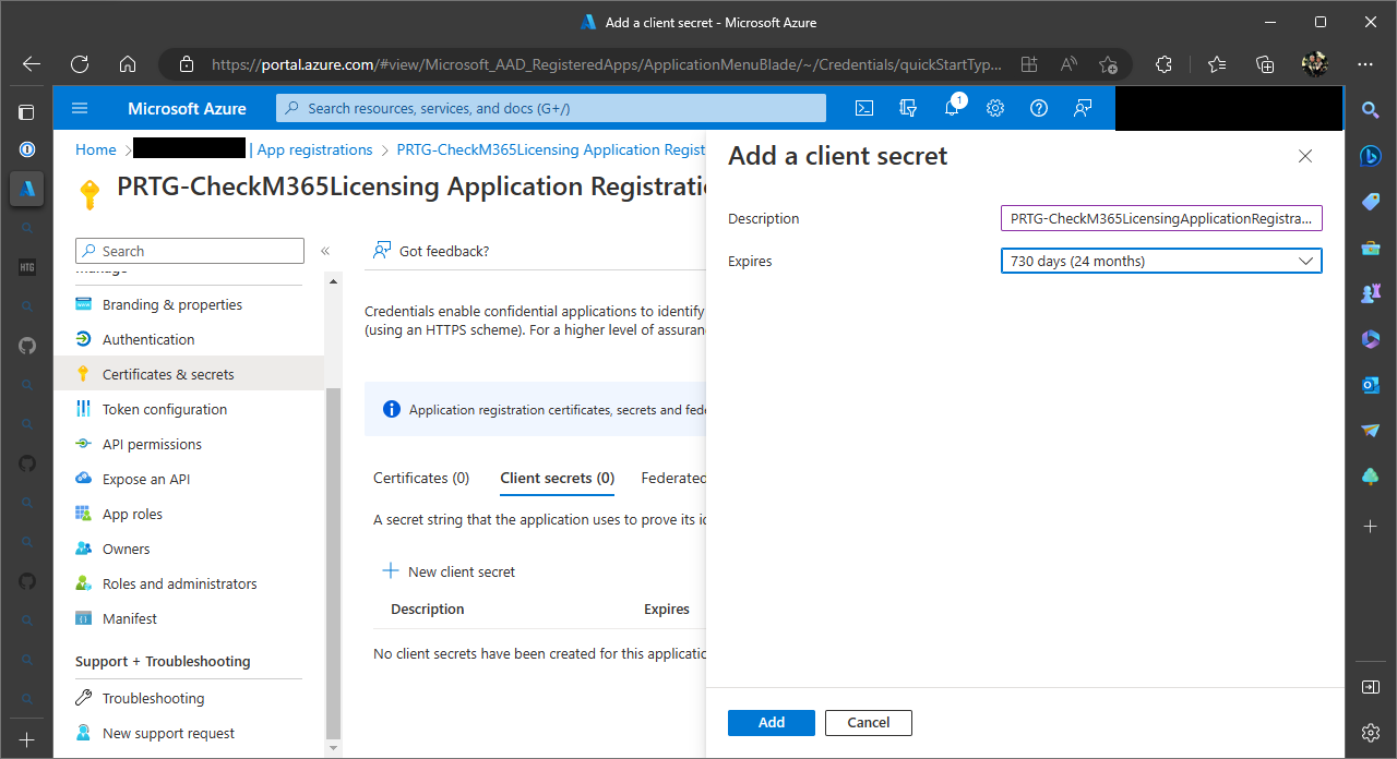 Create a secret for the application registration for up to 2 years. Make sure you record your application secret in a password manager or you may have to regenerate it.
