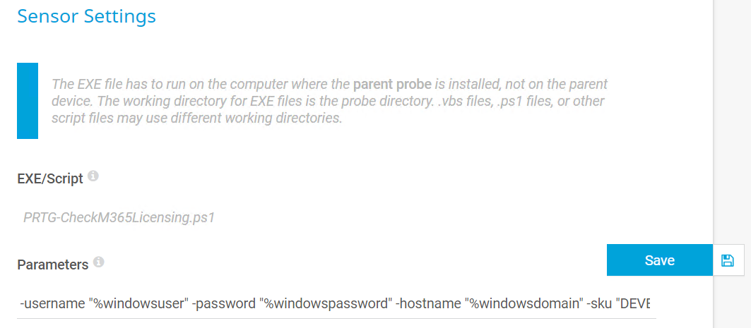 Scroll down to Sensor settings and select the PRTG-CheckM365Licensing.ps1 PowerShell script. Also provide the following parameters: