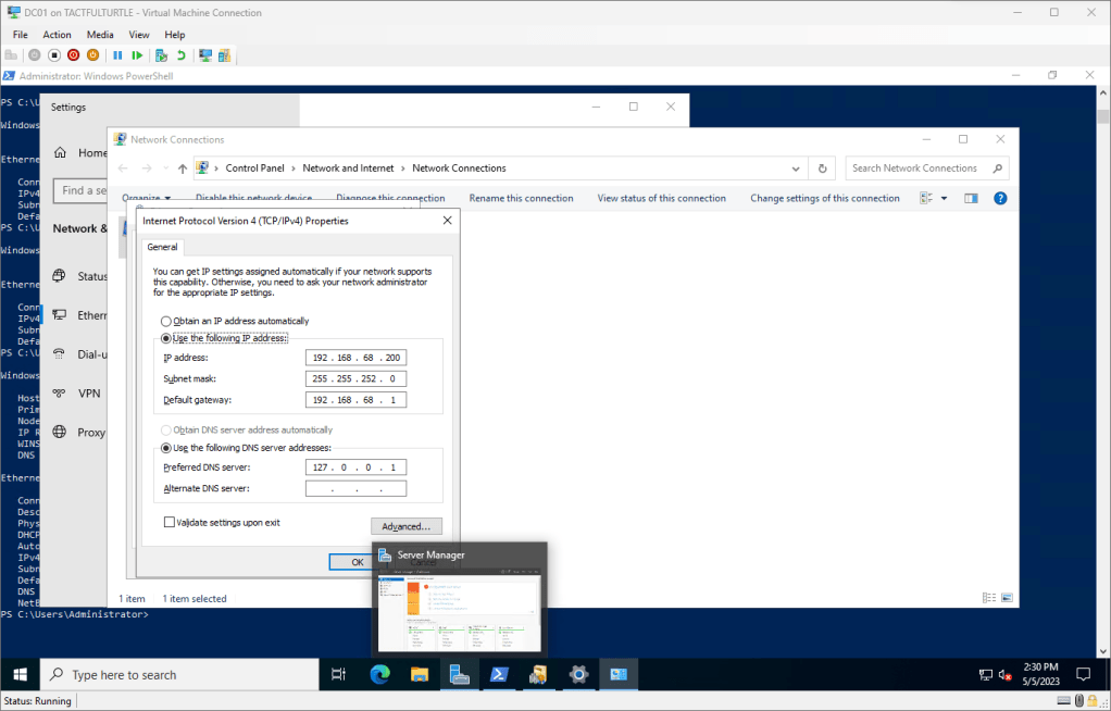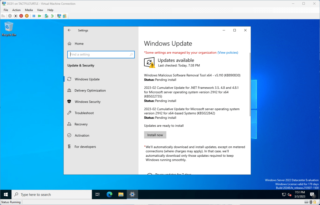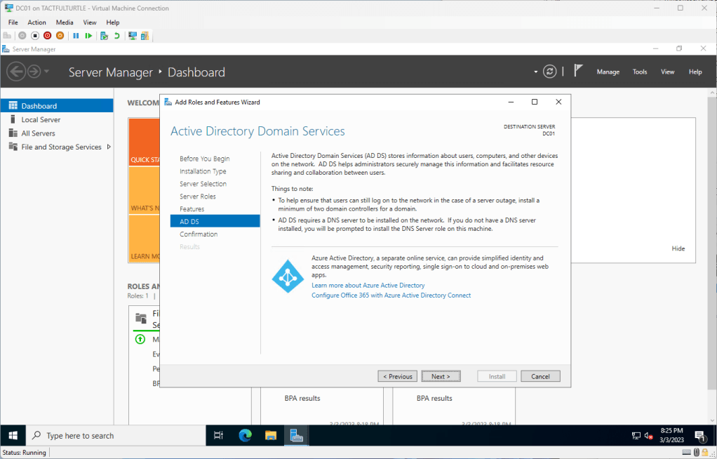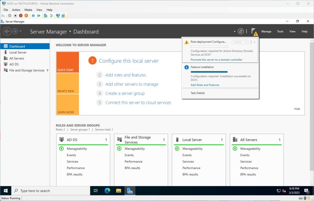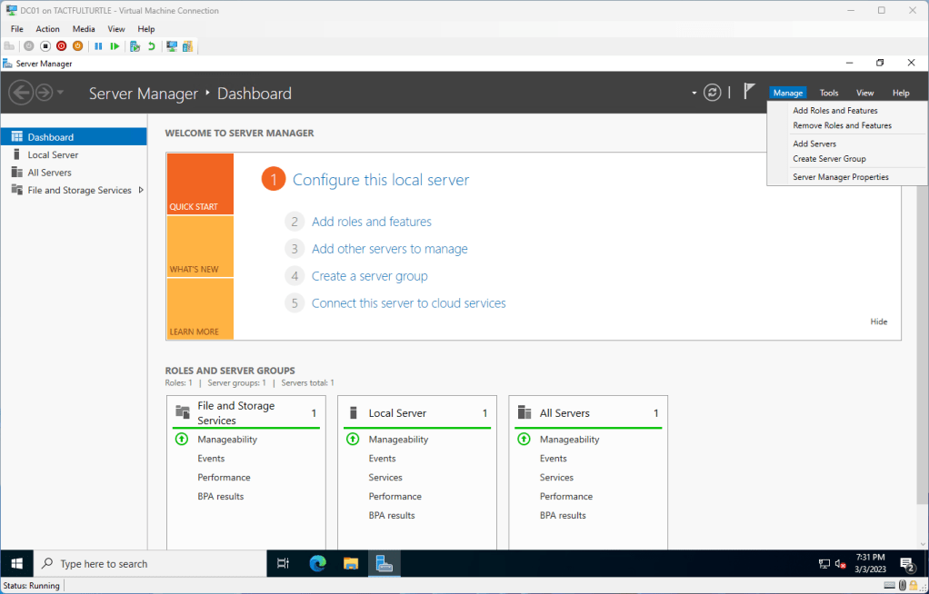 I still have some AD cleanup and checks to do. Maybe some simple group policy to do. And finally connect it to my developer tenant. Maybe I should revisit my goals and generate a high level of tasks I want to accomplish? We’ll see.