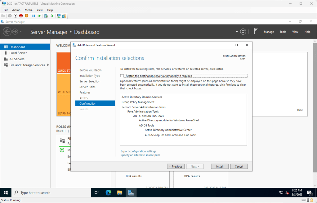 I typically check the Restart the destination server automatically, then click Install.