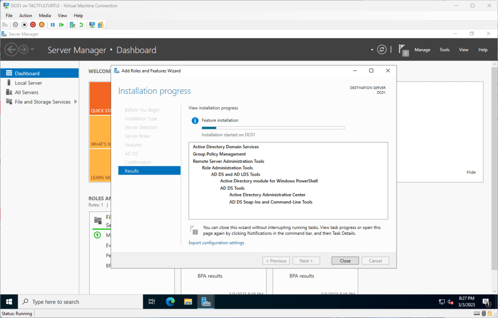Wait for it to finish. You can safely click Close if you wish. Server Manager will prompt when complete.