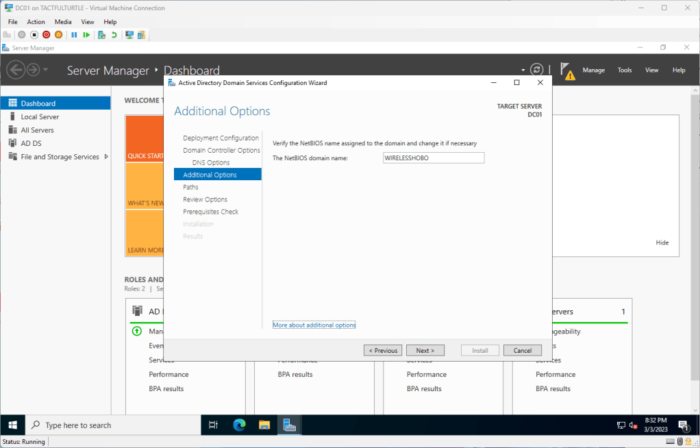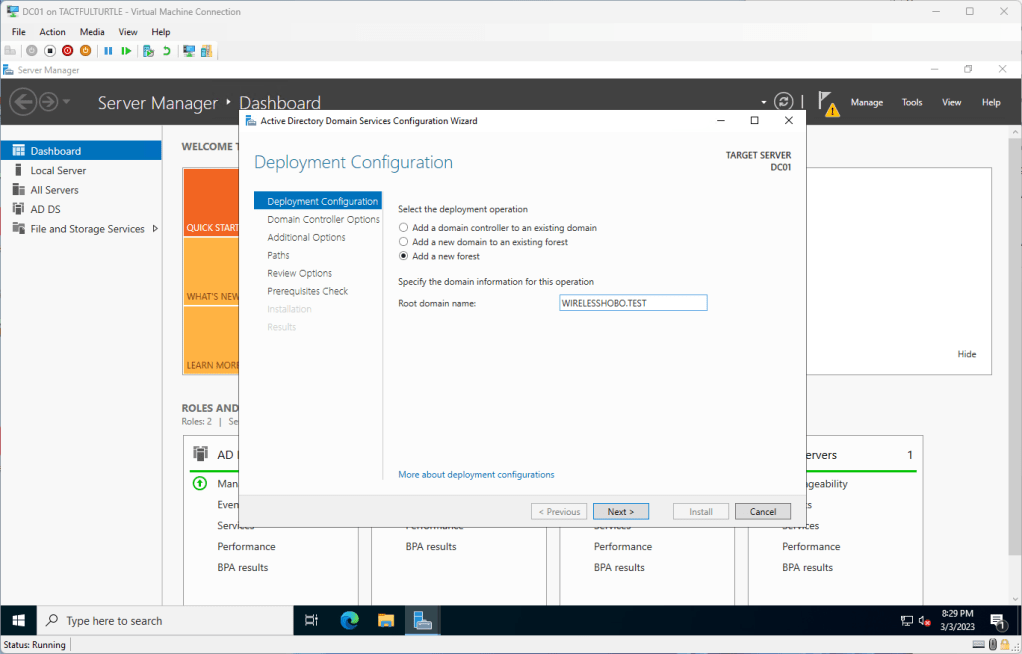 This is my first domain controller in my entire environment, so it is my first forest. Make sure Add a new forest is selected and fill in your Root domain name. There are some schools of thought on naming, but Microsoft has the most definitive thoughts on this topic, especially disjointed name spaces. That said, for my test environment, I accept my test lab will be disjointed with WIRELESSHOBO.TEST.