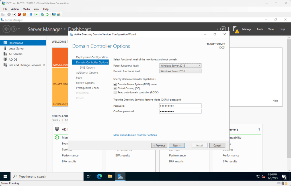 I didn’t see new functional levels prior to install of Server 2022 because 2016 Forest and Domain functional levels are maxed out at 2016. Make sure Domain Name Server and Global Catalog are selected. Set a DSRM password. Keep it secret. Keep it safe.