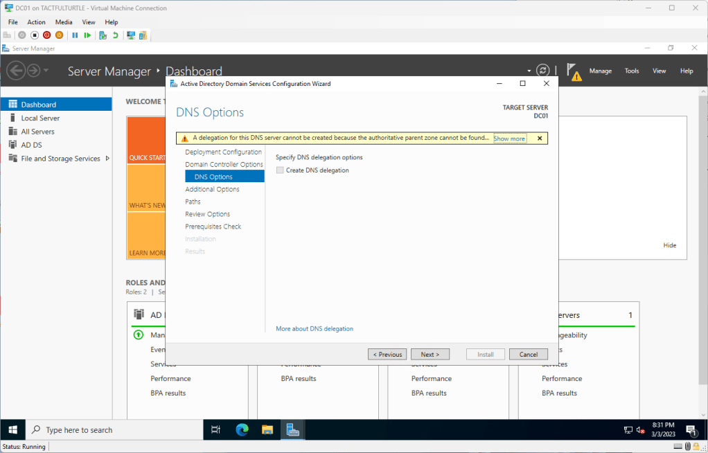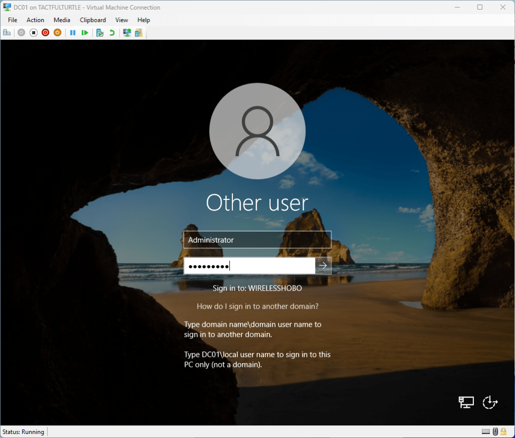When done, reboot the box if it doesn’t reboot. Sign in with the Administrator account set for the domain. Important to note that domain controllers do not have a local administrator account.
