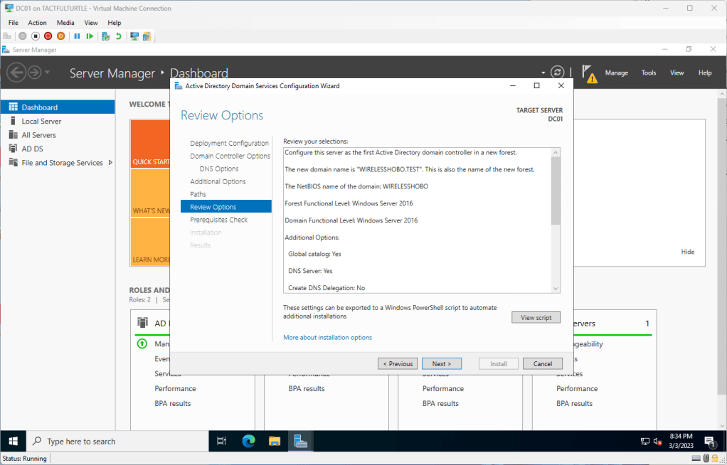 Review settings. Check out the script and maybe back it up somewhere should want to try that route later. Next.