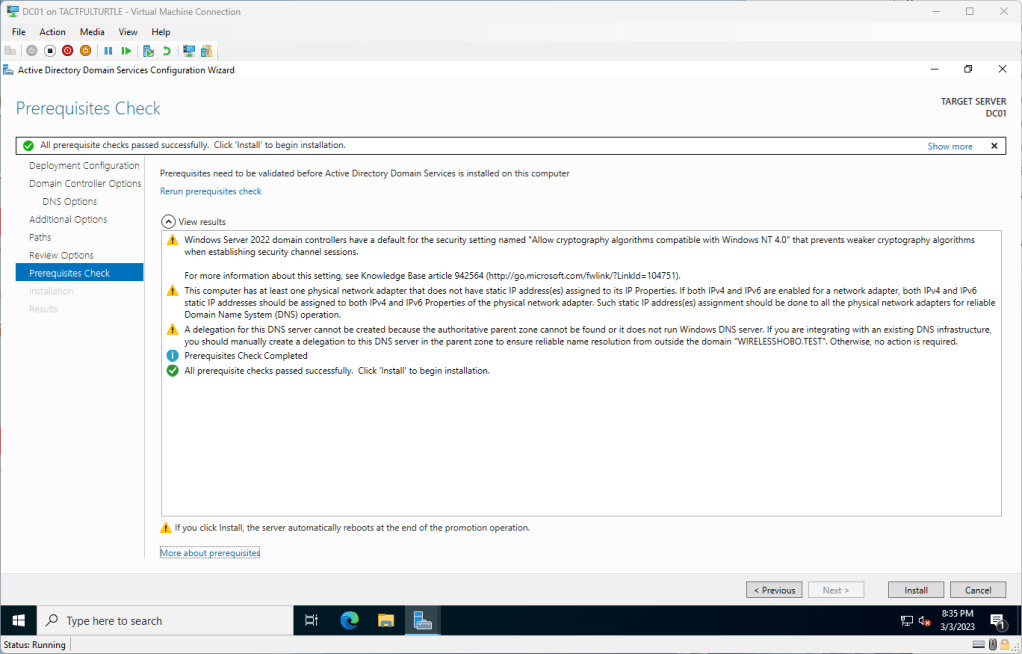 None of the warnings concerned me for a test environment, click Install.