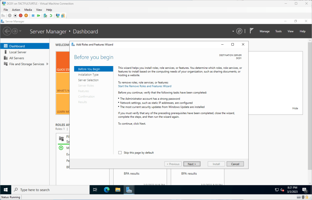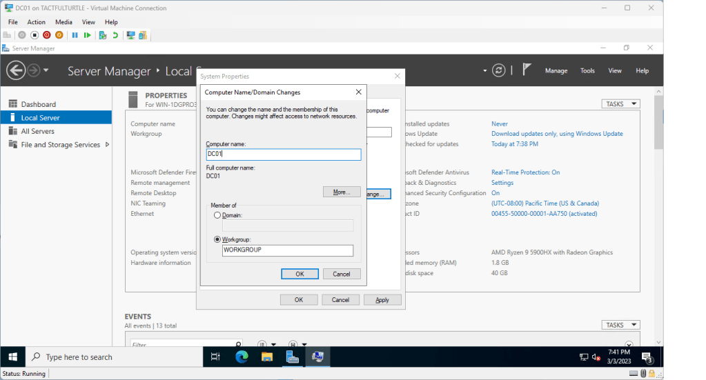 Change the name to something useful. I don’t really use cute names like the members of Fantastic Four, letters of the Greek alphabet, etc. Obfuscation is unnecessary in my opinion. For the first domain controller in my environment, DC01 it is.