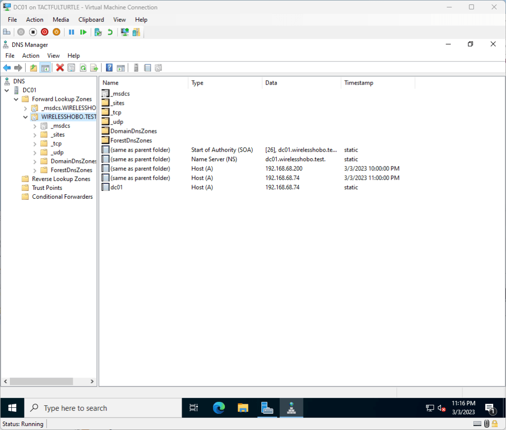 Start up the DNS manager… 192.168.68.74? Ooops, I think my DC is on dynamic host configuration protocol (DHCP).