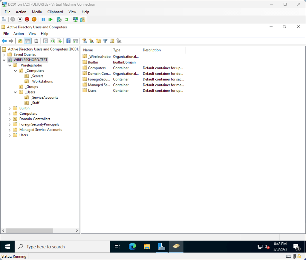 Fire up Active Directory Users and Computers. You will probably see just a lonely domain controller under Domain Controllers. We will add some friends soon.