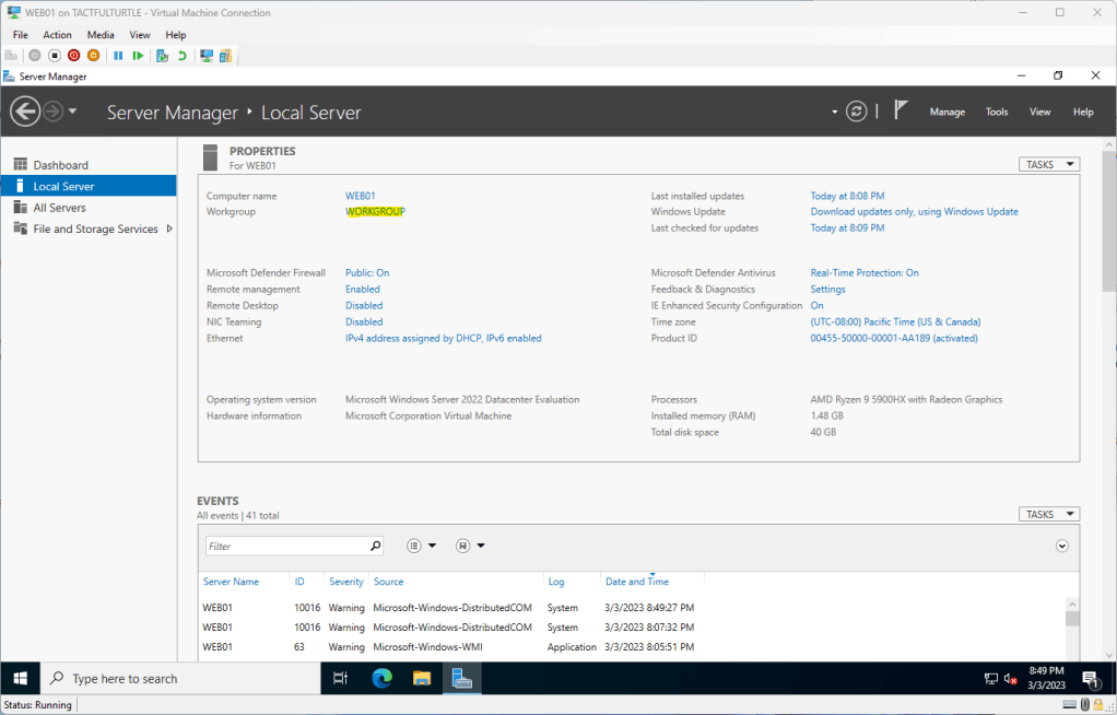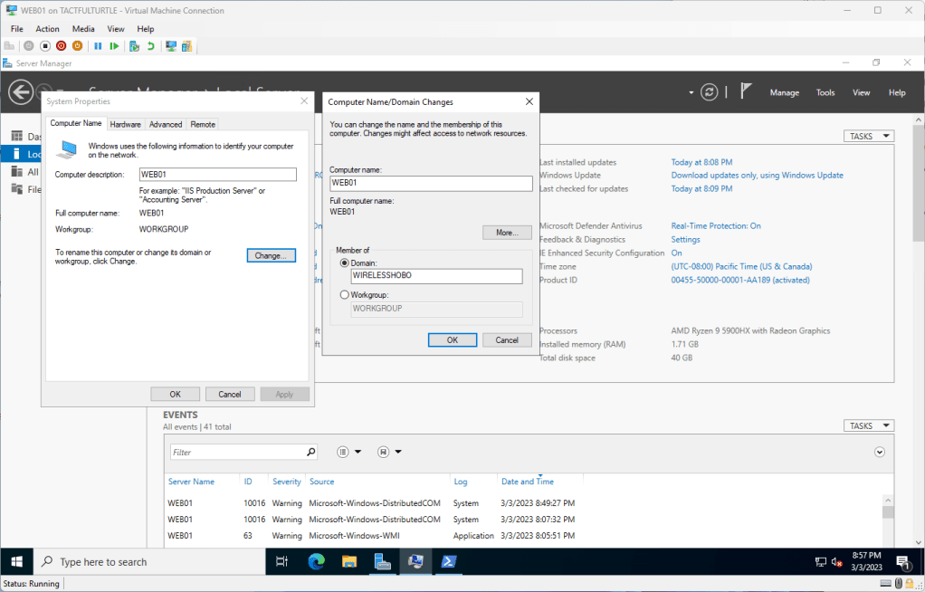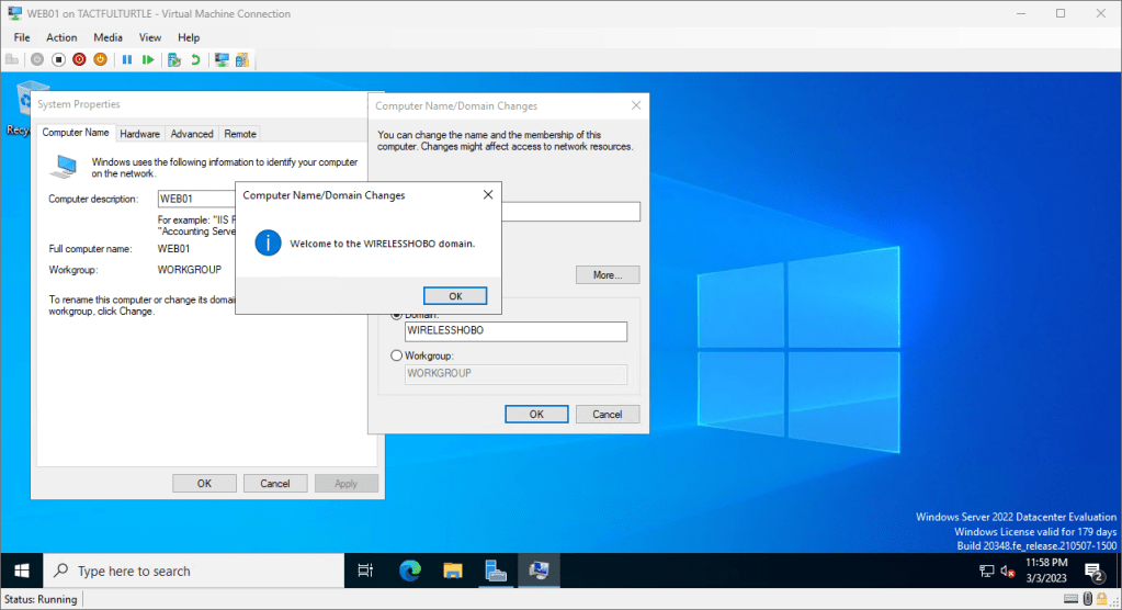 Now that the domain is up and running, let’s join a test web server to the domain. From the web server, click on Workgroup in Server Manager -> Local Server.