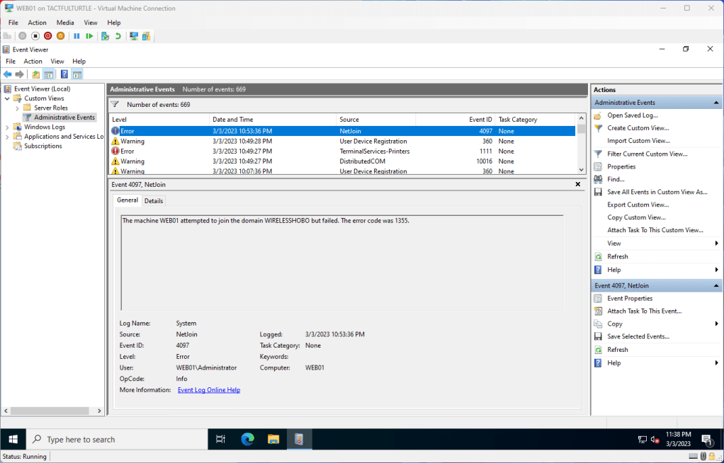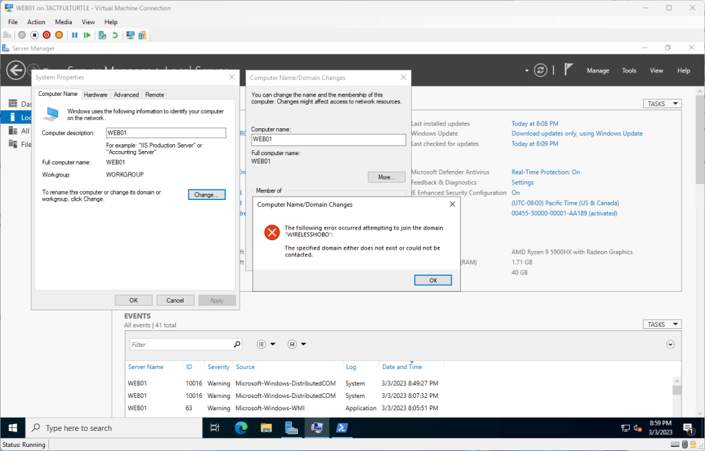 Oops. Turns out IPV6 isn’t configured in my test environment and I couldn’t join the web server to the domain. Again for the purposes of this lab, I don’t care about IPV6 at this time.