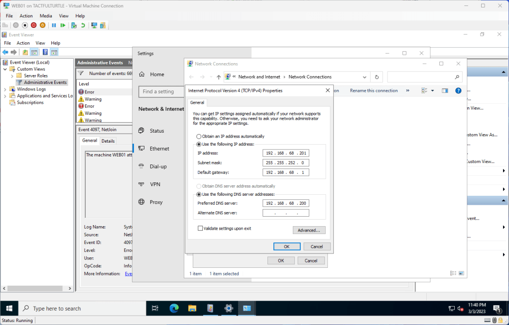 Statically set the IP address for WEB01 to 192.168.68.201.
