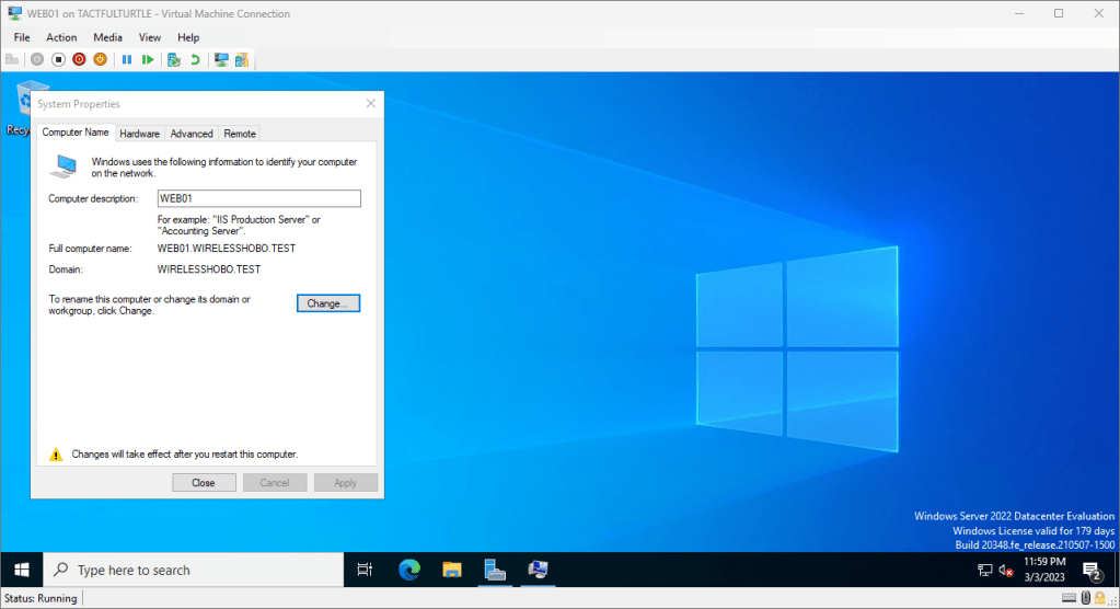 Click on the Change button to join to the WIRELESSHOBO domain.