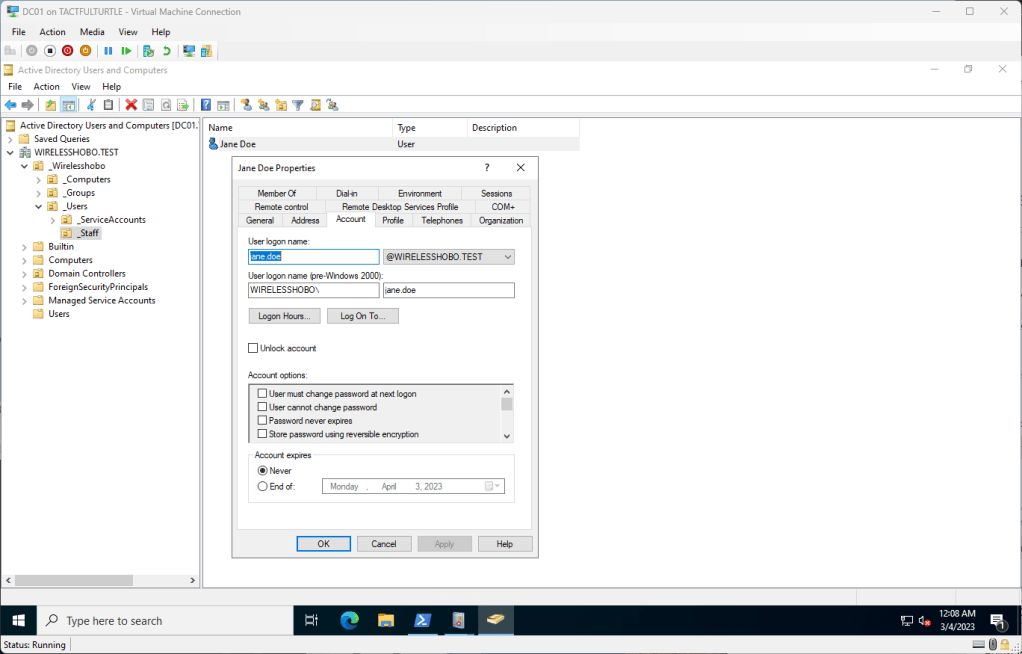 Let’s create a test staff user on DC01. Jane Doe is born!
