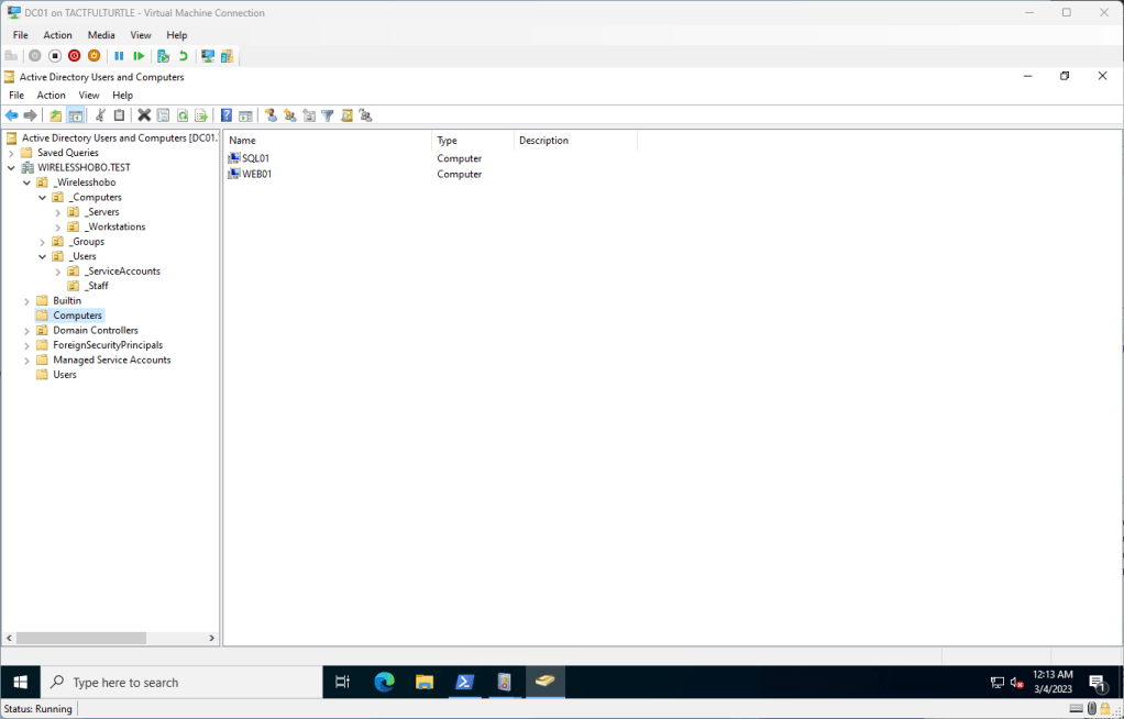 After adding the SQL01 server to the domain, notice that the join process automatically put them in Computers by default. We will come back to that in another post.