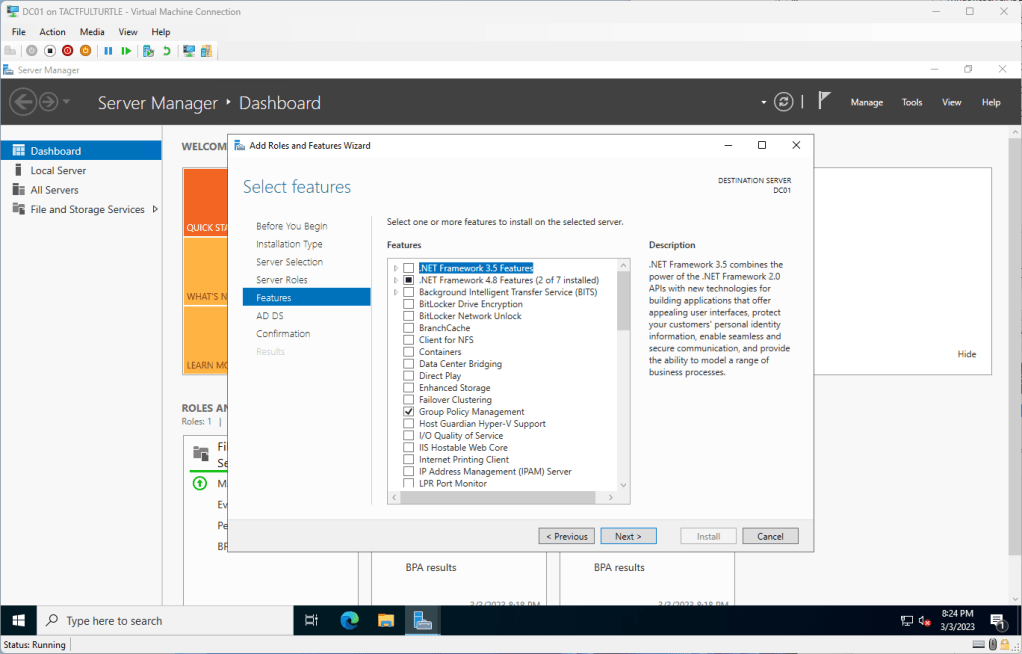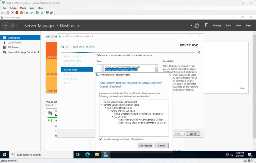 In Server Roles, check Active Directory Domain Services, generating a popup dialog like shown below. Make sure Include management tools is checked too. Click Add Features.