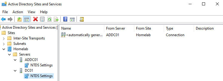Start up Active Directory Sites and Services. Renamed the Default First Site Name to Homelab. Notice that DC01 automatically has replication to ADDC01.