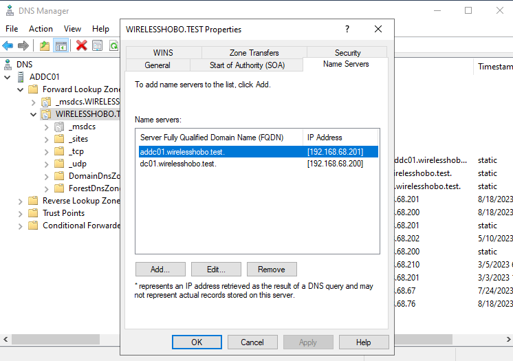 Let’s do a quick DNS check as well. Checking the properties of the primary zone, it looks like our new DNS server has been added and pointing at the right IP address.