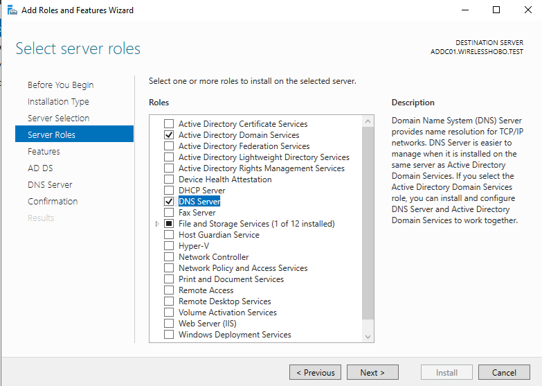 - Server Roles. Check Active Directory Domain Services and DNS Server. Next.