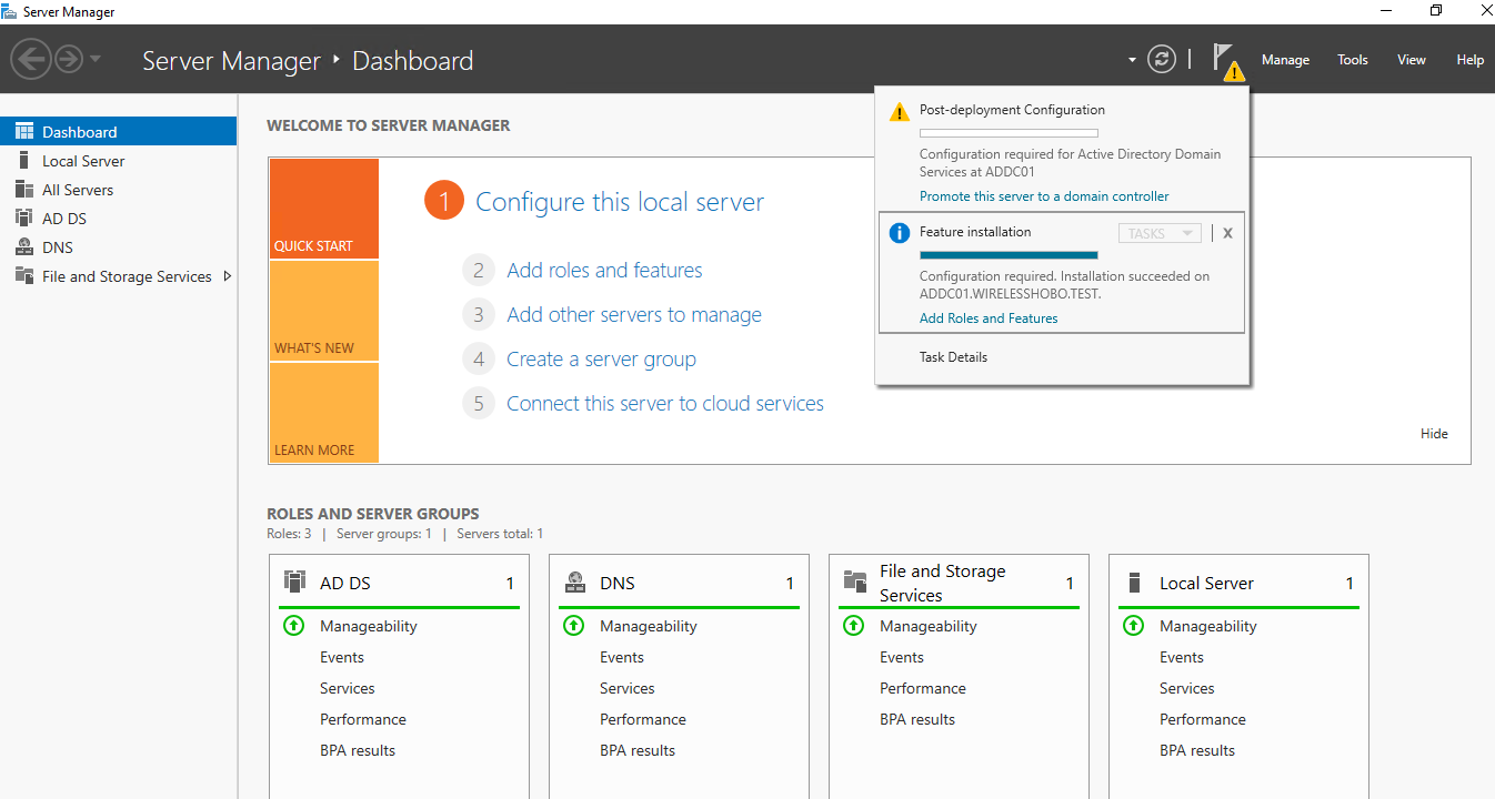 - Once installed, it is time to promote ADDC01 to a domain controller.