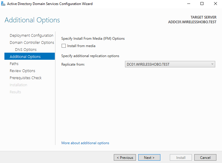 - Replicate from DC01. The default is any DC, but I like to be a bit more specific and replicate from the server I am replacing.